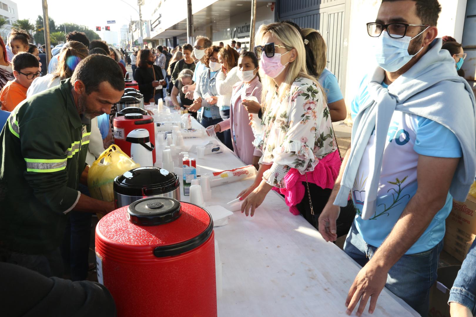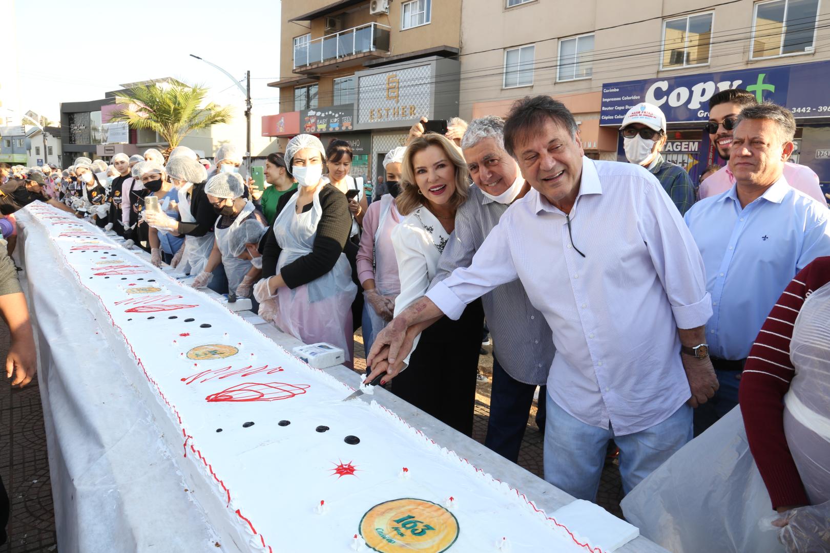 Bem cedinho, por volta das 07h30 da manhã, com o prefeito Adib Elias, a primeira-dama Adriete Elias e o vice-prefeito João Sebba, milhares de pessoas cantaram parabéns pelo aniversário da cidade. Em seguida, foi realizado o tradicional corte do bolo de 163 metros, 1 metro para cada ano de aniversário do município. E quem esteve na Avenida Raulina Fonseca Paschoal, além do bolo, pode se deliciar com outros acompanhamentos, como: café, chá, leite puro e leite com chocolate. O aposentado Ademar Camargo participou do corte do bolo com a esposa Iraci. “O bolo tá uma beleza! É bão demais comemorar o aniversário de Catalão assim, com o povo em festa. Catalão tá em boas mãos”, disse Camargo.