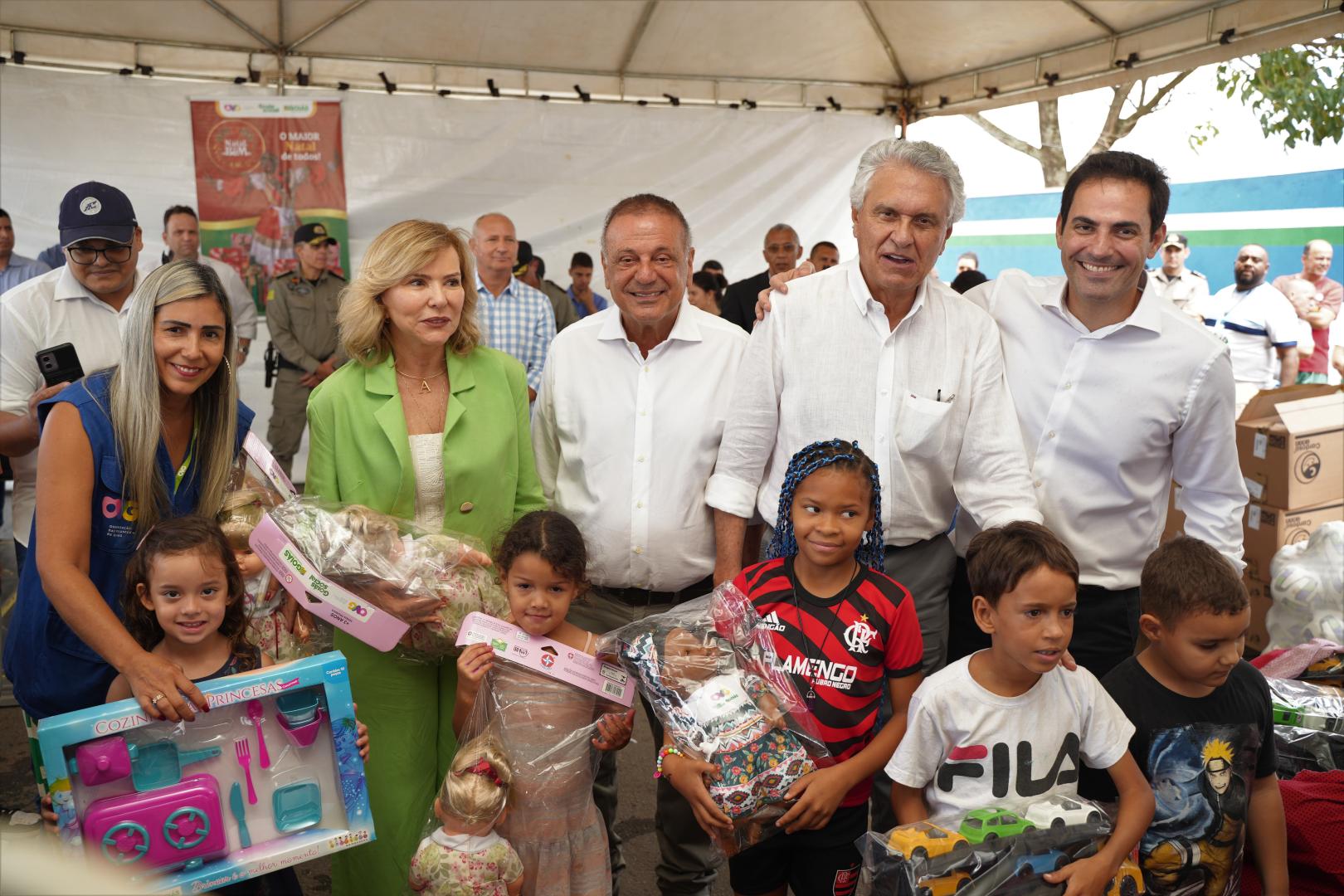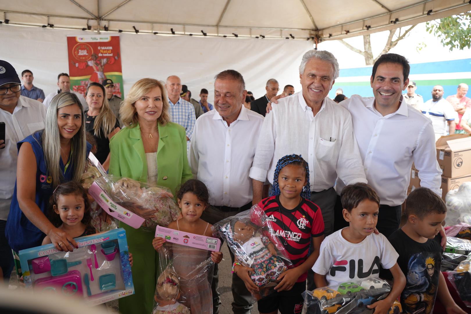 Em seguida, ainda no Bairro das Américas, em Catalão, o governador, a primeira-dama e secretária de Promoção e Ação Social, Adriete Elias, Jamil Calife e o prefeito Adib Elias, participaram da entrega de 7,3 mil brinquedos do Natal do Bem no município.