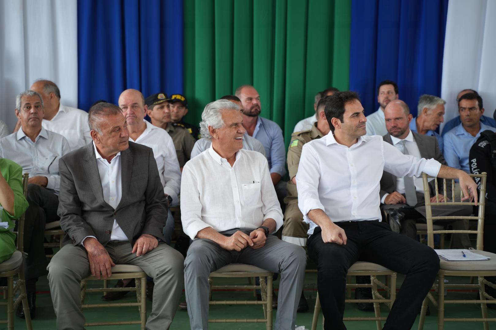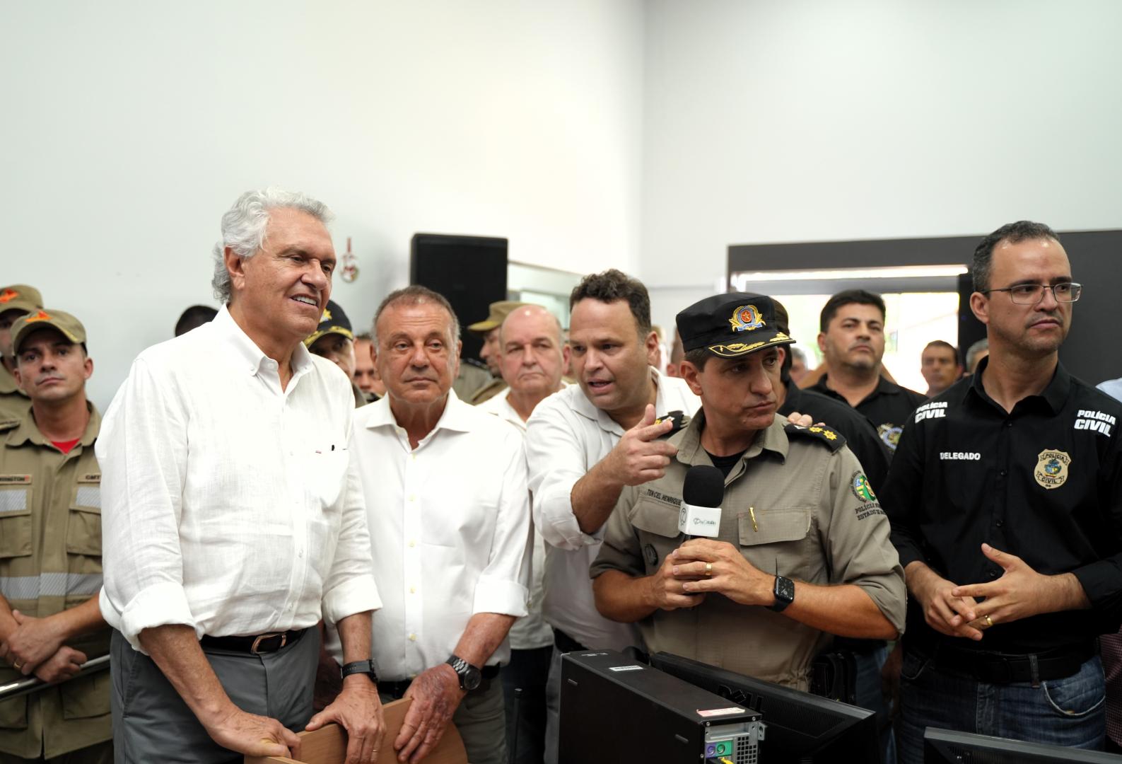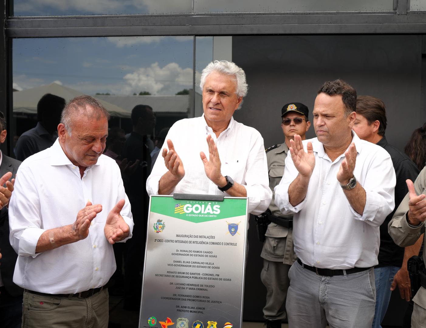 Logo depois, no 18º Batalhão da Polícia Militar de Catalão, Caiado, Adib e os comandos das polícias: Militar, Rodoviária Federal, Civil, Científica, Penal e Corpo de Bombeiros, da SMTC, do SAMU, da Secretaria Municipal de Ciência e Tecnologia e da Secretaria Municipal de Meio Ambiente, descerraram a placa de implantação do CIICC - Centro Integrado de Inteligência Comando e Controle de Catalão. A estrutura, mantida em parceria com a Prefeitura de Catalão, é uma importante ferramenta de planejamento operacional das forças de segurança e permite o monitoramento de vários pontos da cidade.
